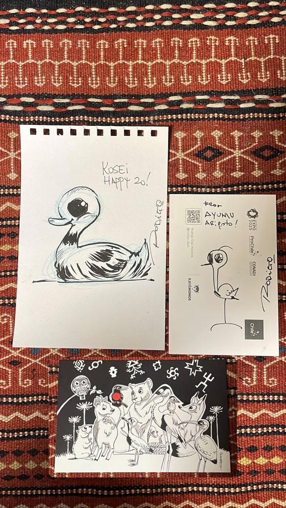 伝統舞踊が始まるのを待つ間に、目の前でかわいいポストカードを並べて絵を描いている男性がいたので、話しかけてみたところ、ポストカードにサインとArigatoと書いて渡してくれました。一緒に万博に行った息子が、偶然にも誕生日だったので、それを伝えると、息子には絵を描いてプレゼントしてくれました!