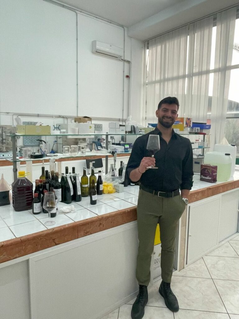 案内と説明をしてくれたフランチェスコさん。(空手家とのことです!)休みの日もワインが気になって、ワイナリーに来てしまうと言われていました。この部屋はラボになっていて、ワインの品質管理、分析、モニタリング、評価などが日々行われているようです。