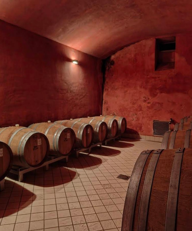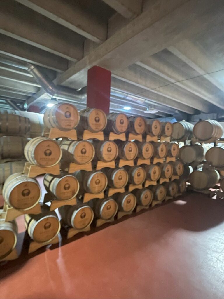 どこまでも続く樽の数々。フランス産・アメリカ産のオーク樽が使われているそうです。本当に広いセラーでした!